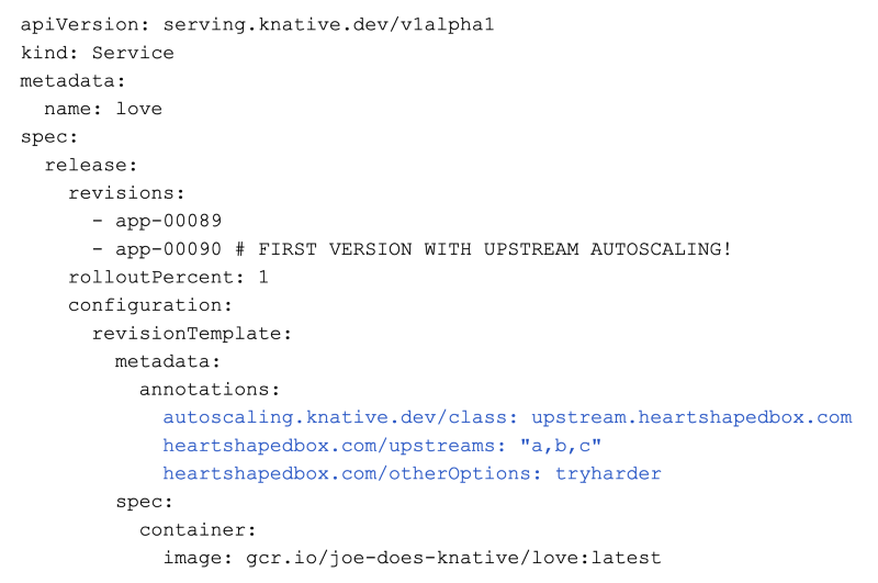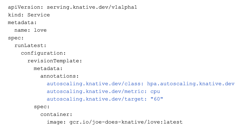 But eventually you conclude that you just need to scale on CPU to keep your machines hot. So you choose a different Knative autoscaling class entirely. The class annotation will tell Knative to use a different PodAutoscaler controller implementation, kinda like Kubernetes Ingress.