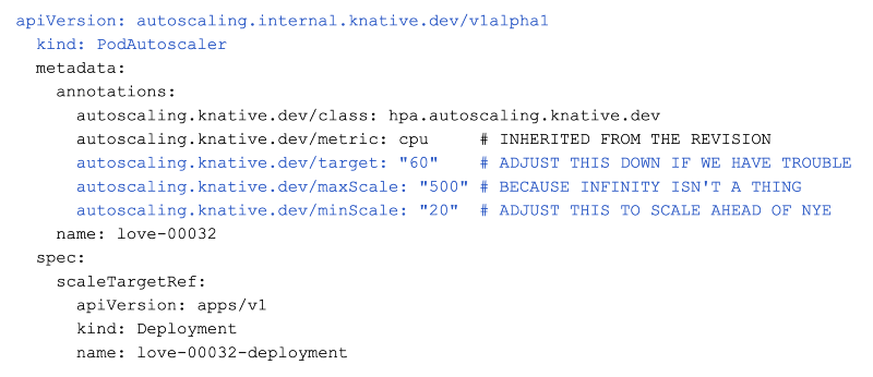 Luckily, Dr. Mark has been doing his reading in the Knative Serving release notes and begins experimenting with editing the PodAutoscaler on pre-existing Knative Revisions. The PodAutoscaler is where Knative keeps its autoscaling state and configuration for a Knative Revision. And unlike the Knative Revision, it’s mutable (on purpose). You make a plan to ramp up capacity slightly ahead of traffic as it builds to each NYE event across the globe (yeah, it happens 24 times!)